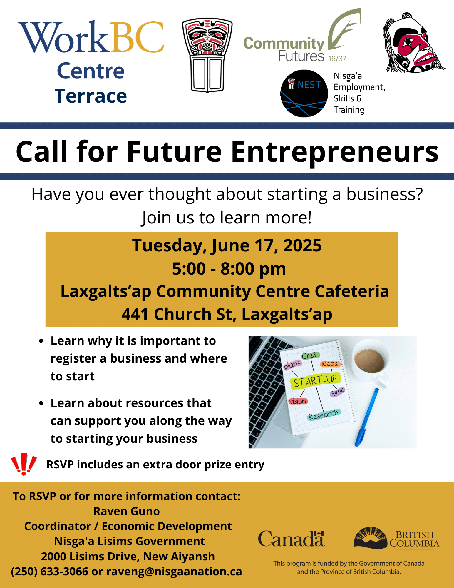 We will be in the Laxgalts’ap on June 17th with Community Futures, Nisga’a Lisims Government, TRICORP, and NEST to provide some information to those interested in starting a business.