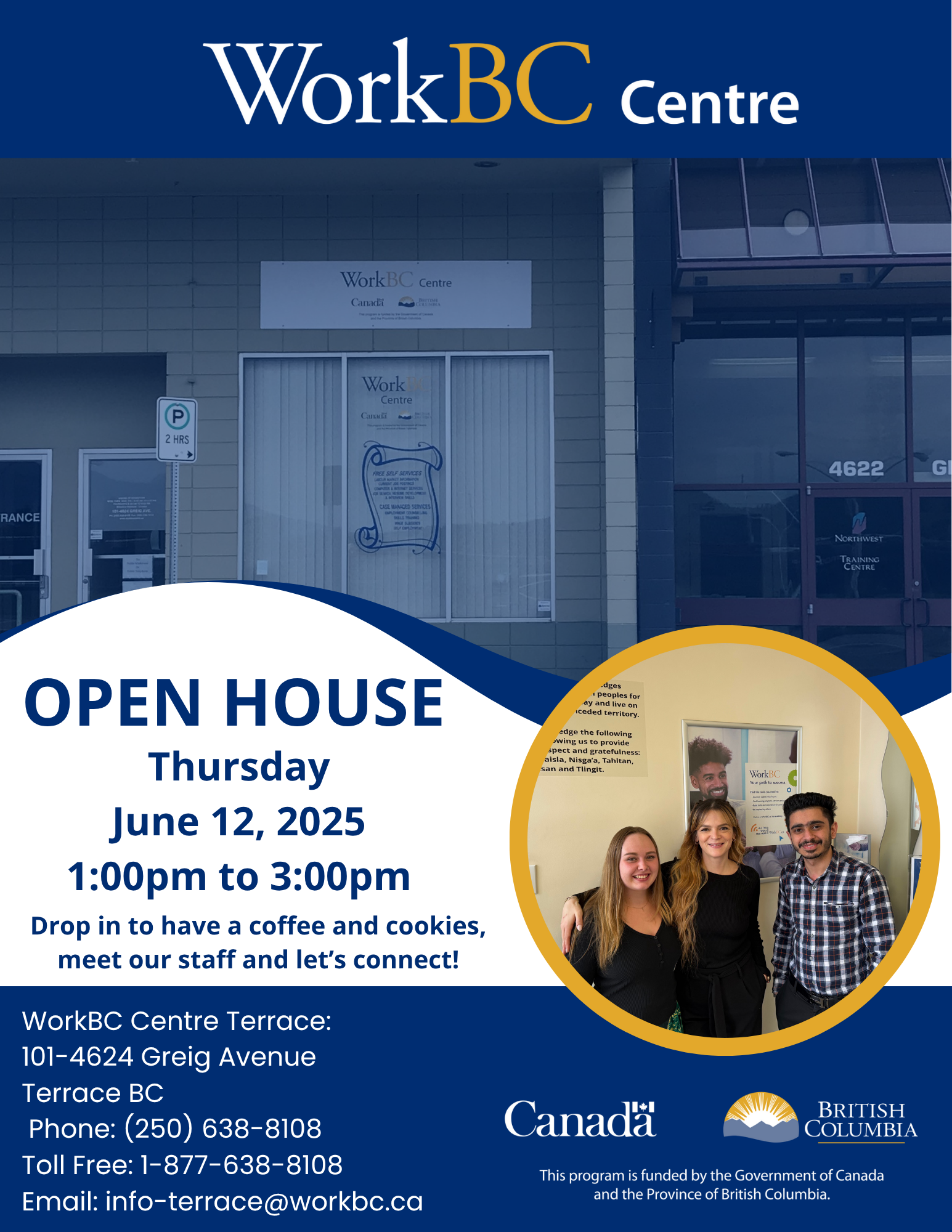 Join us for our Open House at WorkBC Centre Terrace on June 12 from 1–3 PM in our Resource Room!